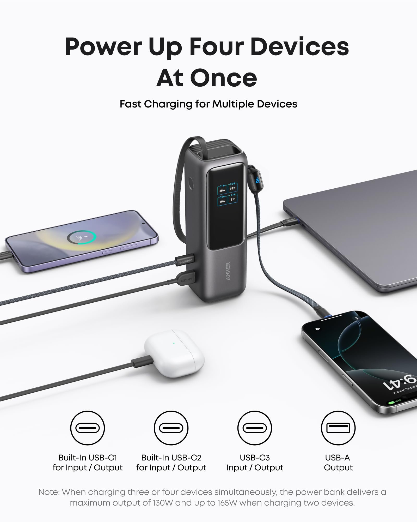 | Features | Triple 100W USB-C Ports for Multi-Device 25,000mAh for Long-Haul Power Dual Built-In Cables for On-the-Go Use Charge 4 Devices at Once |